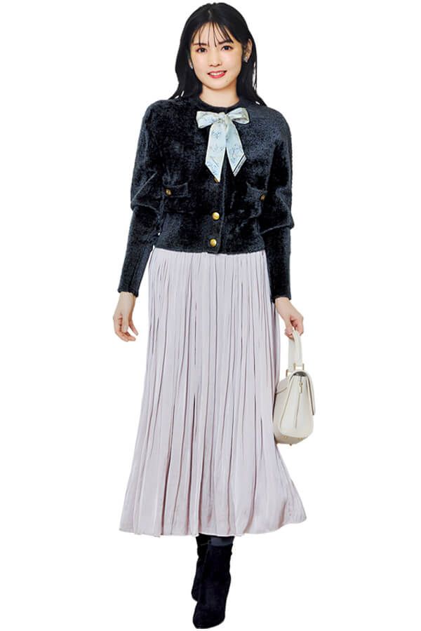 スカーフ¥15,400/ボナべンチュラ カーディガン¥17,600/アルページュ ストーリー スカート¥19,800/TIARA イヤリング¥3,850/アネモネ(サンポークリエイト) バッグ¥12,100/MERCURYDUO タイツ¥1,320/靴下屋(Tabio) 靴¥46,200/銀座かねまつ(銀座かねまつ6丁目本店)