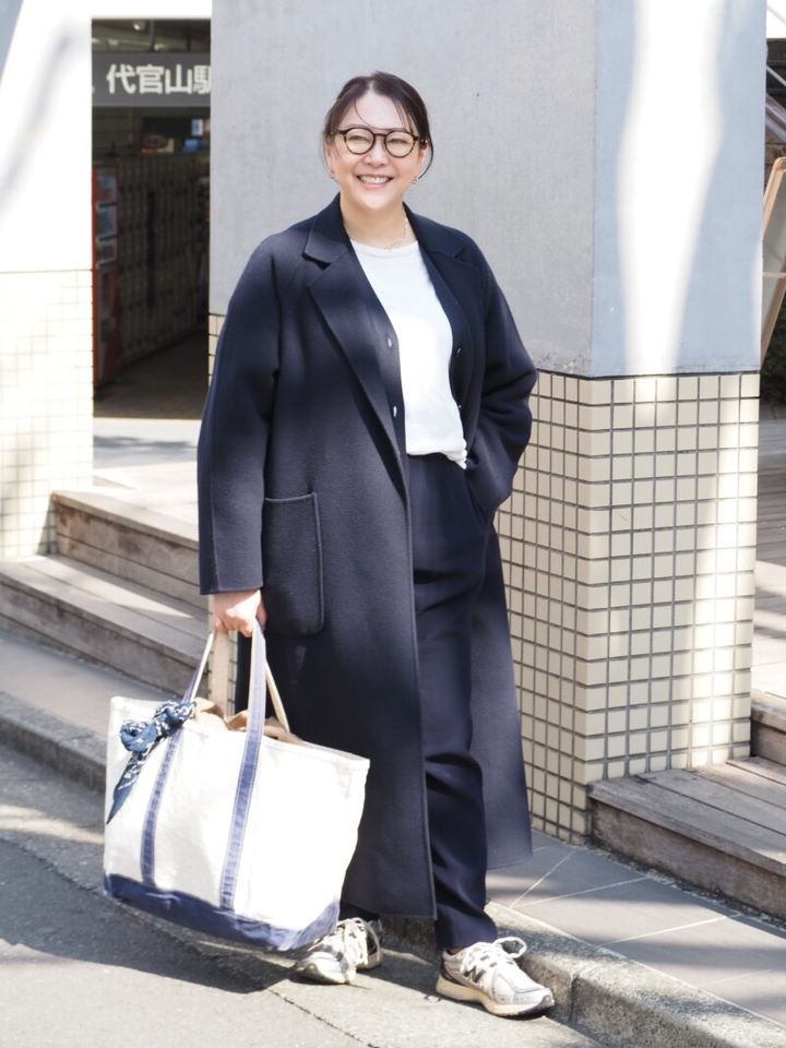 ロングコートとパンツをネイビーでまとめ、トップスは顔映りのいい白いカットソーをチョイス。通勤コーディネートにふさわしいきれいめなスタイリングに、ハイテクスニーカーをプラスするのがポイント。スポーティMIXを楽しむ都会派コーディネートに仕上がっています。