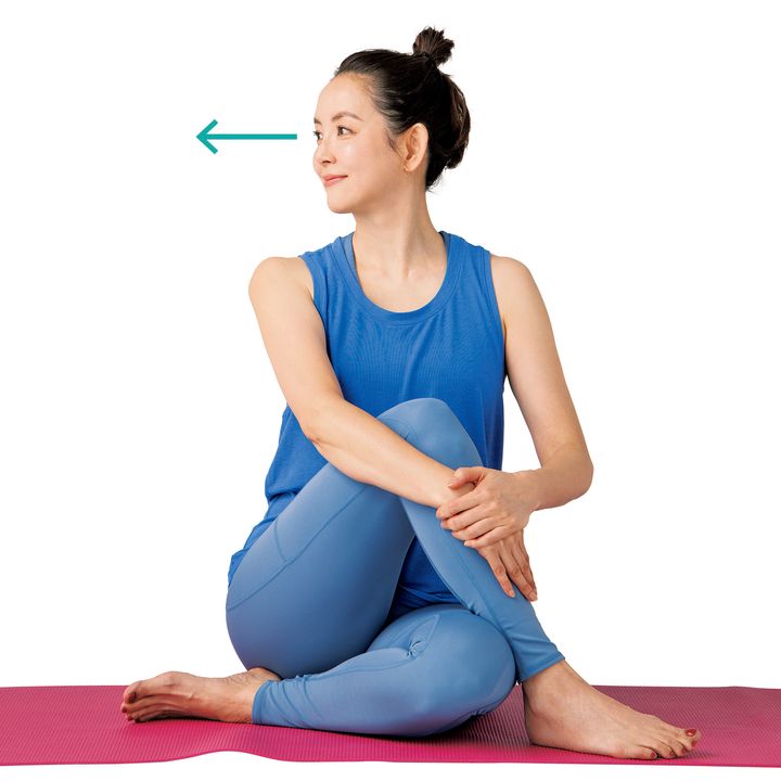①背筋を伸ばして座り、左足のかかとが右のお尻につくように、膝を曲げ、床に寝かせる。右足は膝を立て、左足の外側にセット。膝を両手で抱える。