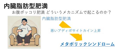 また近年の研究で、お腹ポッコリ肥満では、脂肪細胞から健康に悪いアディポサイトカインという物質が放出されて、生活習慣病につながることが分かってきています。