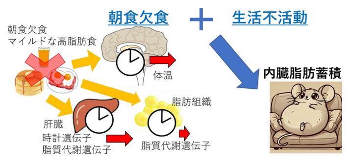 研究者は「朝食を抜くことで、体内時計が乱れて、体温上昇のリズムが遅れ、肝臓や脂肪組織の脂質代謝関連遺伝子のリズムも遅れることで、脂質代謝が乱れて内臓脂肪の蓄積が起きやすくなる」と説明しています。