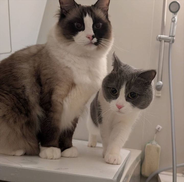 さらに、ラグドールの『コテツ』くん(左)もやって来て、まるくんと一緒にお風呂の蓋の上に乗っています。