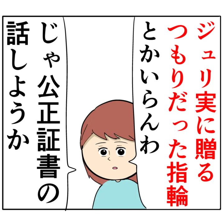 そして「ジュリ実に贈るつもりだた指輪とかいらんわ」と言い放ち、めいさんは何事も無かったかのように「じゃ、公正証書の話しようか」とあっさり話題を切り替えました。
