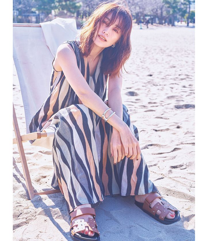 「ワンピやTシャツ……、服がサラッとしがちな春夏は小物力に頼りたくなります。ノーブルなキャメルレザーとアイコニックなピラミッド型スタッズ、その存在感でどんな装いもモダンに仕上げてくれる頼もしい存在です」(モデル・蛯原さん)