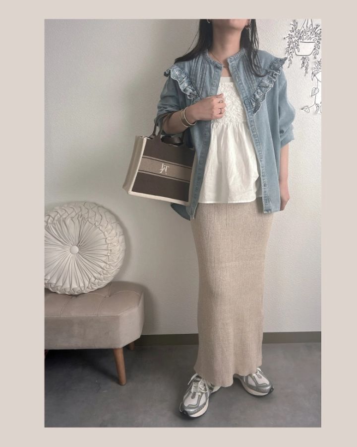 刺繍フリルで華やかに♪デニムシャツでつくる春の淡色コーデ