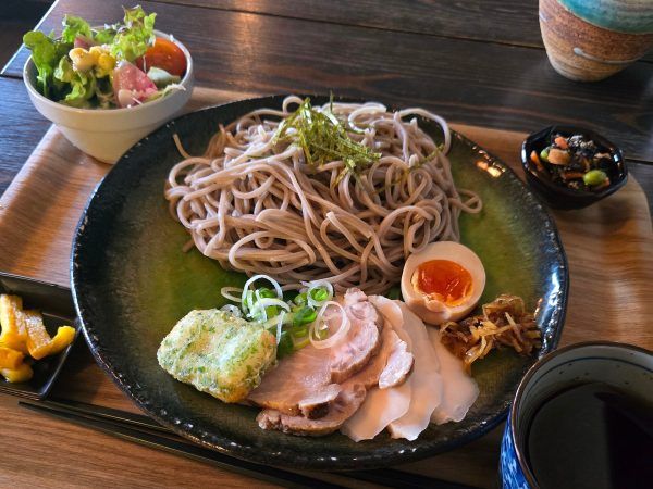 うさぴょんぴょんが注文したのは、看板メニューの一つである「特製つけ蕎麦」。低温調理された鶏ハムや生姜の佃煮、とろーりとした味玉などが添えられ、4種類のつけ汁から選べるという点に、店主さんのこだわりが感じられました。 シンプルながらも奥深い味わいは、懐かしさと新鮮さが絶妙にミックスされた逸品でした。