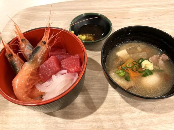 食べて飲んで、締めは担々麺やカレーうどんも魅力的だったけど、ごはんに甘エビ、イカ、マグロをのせて海鮮丼にし、仙台芋煮と一緒に。
