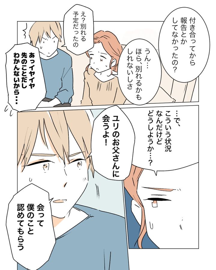 「付き合ってから報告とかしてなかったの?」ジュンにそう聞かれ、「うん・・ほら、別れるかもしれないしさ」と答えると、「え?別れる予定だったの」と驚くジュンに、「あっ、イヤイヤ先のことだしわかんないから・・」と言った後で、「・・で、こういう状況なんだけどどうしようか・・?」と言うと、「ユリのお父さんに会うよ!会って僕のこと認めてもらう」そうジュンが言いました。