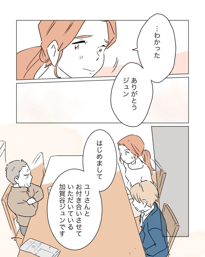「はじめまして。ユリさんとお付き合いさせていただいている加賀谷ジュンです」ジュンが挨拶すると、