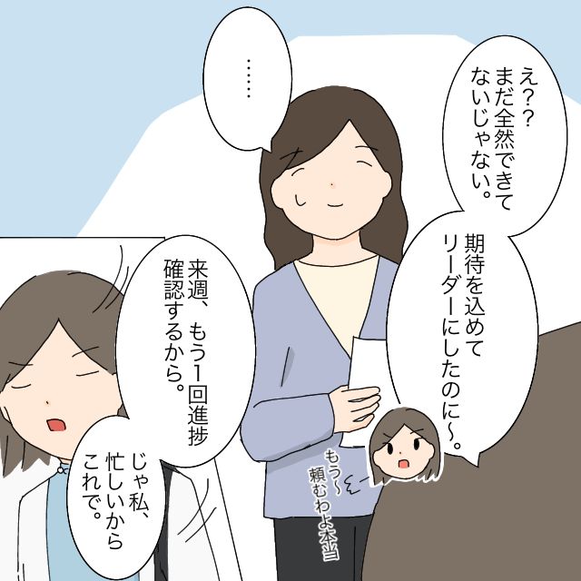 卒業祝賀会の進捗状況を確認され、全く進まない現状を伝えると、だい君ママは「期待を込めてリーダーにしたのに~。頼むわよ本当」とため息とともに苦言を呈しました。そして「来週、もう1回進捗確認するから。じゃ私、忙しいからこれで。」と、言うことだけ言ってサッサと行ってしまいました。