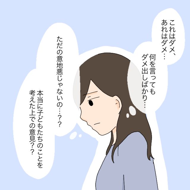 これはダメ、あれはダメ。何を言ってもダメ出しばかり。ただの意地悪じゃないの?と思えてきました。本当に子どもたちの事を考えた上での意見なのか、疑問です。