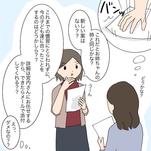進捗報告する約束の日、出来上がった企画案を出すと、だい君ママは「これだとお姉ちゃんの時と同じかな?新しい案はない?」とか、「これまでの慣習にとらわれずに、今の子どもたちに会ったことをするのはどうかしら??詳細は宮内さんにお任せするから、できたらメールで添付してくれる?」と、もっともらしいことを言いつつダメ出し。お姉ちゃんの時っていつ?役員決めの時は「お姉ちゃんの時」を持ち出したのに。