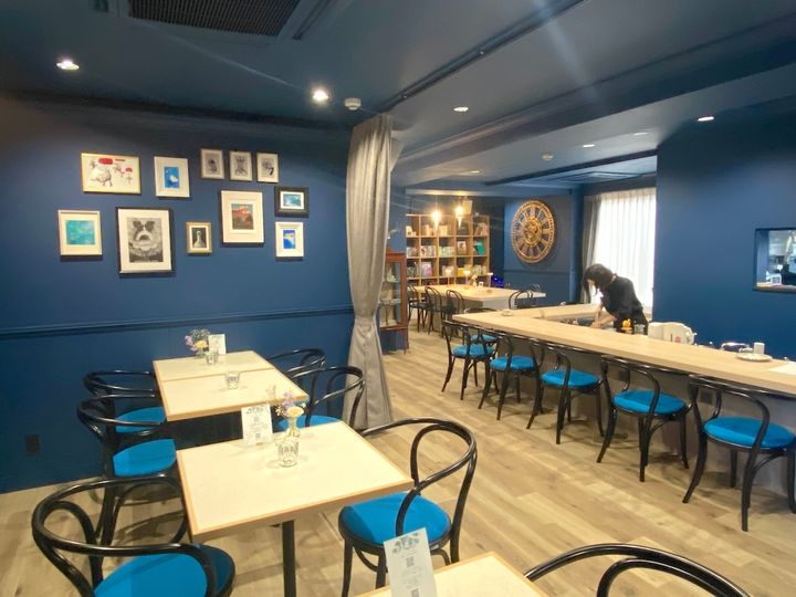 「喫茶[nanashian]」の店内は紺色を基調とした空間になっており、壁に飾られたアートがエレガントな雰囲気を演出しています。座席はテーブル席が18席、カウンター席が8席の合計26席です。