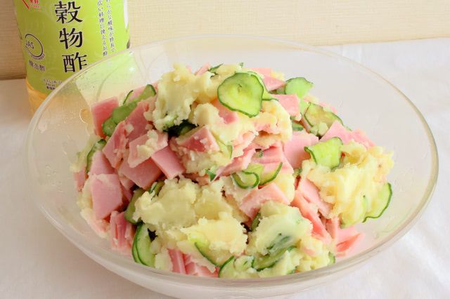 じゃがいもに軽く塩味と酸味を付けておくと、マヨネーズを多く入れなくても味が決まるとのこと。じゃがいもは、ほんのりとした味付けにしておきますが、味見して薄ければ、塩と酢を加えてくださいね。