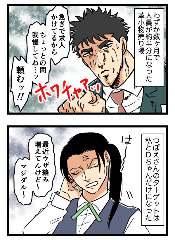 そのことを革小物部署のリーダーのAさんに伝え、つぼえさんにバックヤードでの用事を申し付けられても断るようにしたパチ美さん。それにより、個人売上はもとに戻ったものの、つぼえさんからのいじめは続きました。
