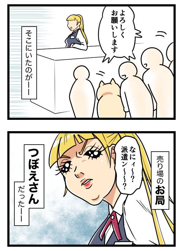 金髪で、上下につけまつげを付け、大きなカラコンを入れているつぼえさんは、その売り場のボス的存在でした。そんなつぼえさんに目をつけられたパチ美さんは、百貨店で働いたことがあるのかどうか聞かれ……。