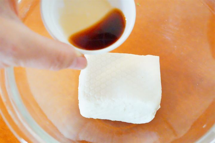 1. 豆腐をキッチンペーパーでくるみ、レンジで2分間加熱後、重しをして冷ます。[A]のクリームチーズは、室温で柔らかくしておく。