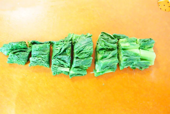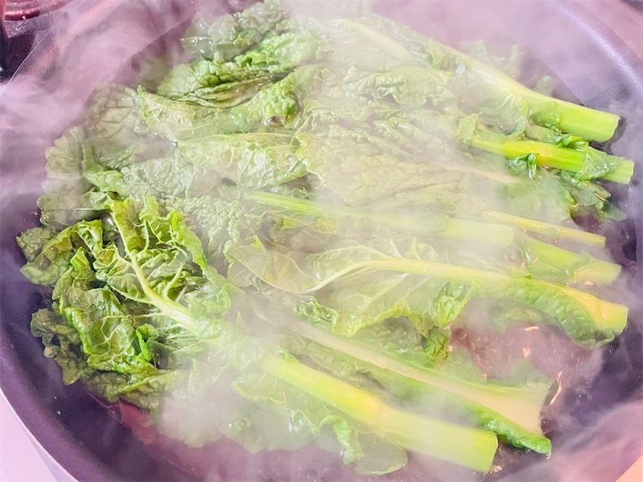 まず茎の方を入れて30秒茹でたら、葉の部分も入れて追加で30秒ほど茹でてください。
