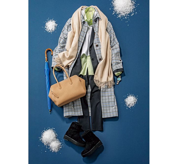 コート¥39,600(エミ/エミ ニュウマン新宿店)ジャケット¥143,000(エンフォルド)シャツ¥37,400(オーラリー)ハーフジップスウェット¥27,500(THIRD MAGAZINE)レギンス¥15,400(マイカ アンド ディール/マイカ アンド ディール 恵比寿店)バッグ¥63,800(ヴァジック/ヴァジックジャパン)ブーツ¥39,600(銀座かねまつ/銀座かねまつ6丁目本店)ストール¥75,900(ジョシュアエリス/グリニッジ ショールーム)傘¥19,800(マッキントッシュ/マッキントッシュ ギンザシックス店)時計¥41,800(ナバル ウォッチ/オンタイム 渋谷ロフト店)