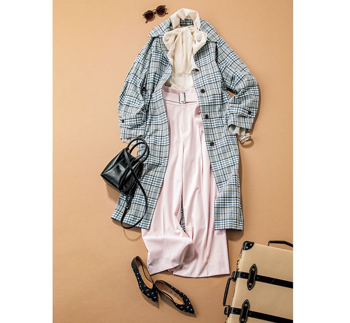 秋冬のイメージが強いチェック柄は、トレンドのパステル合わせで春の甘辛コーデに。