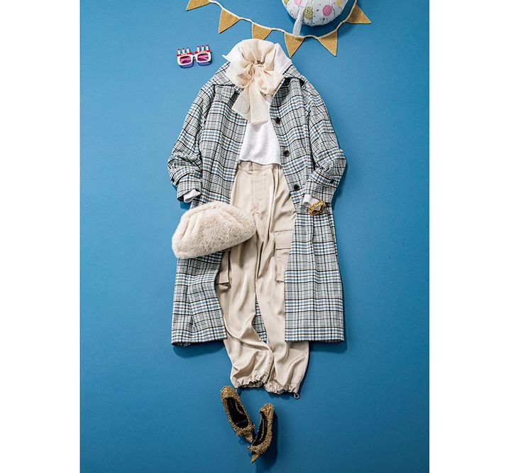 コート¥39,600(エミ/エミ ニュウマン新宿店)ハーフジップスウェット¥27,500(THIRD MAGAZINE)ボウタイブラウス¥17,600(エミ/エミ ニュウマン新宿店)パンツ¥15,400(ステートオブマインド/ゲストリスト)バッグ¥14,300(ダイアナ/ダイアナ 銀座本店)パンプス¥41,800(PIPPICHIC/ベイジュ)バングル¥14,300(アビステ)