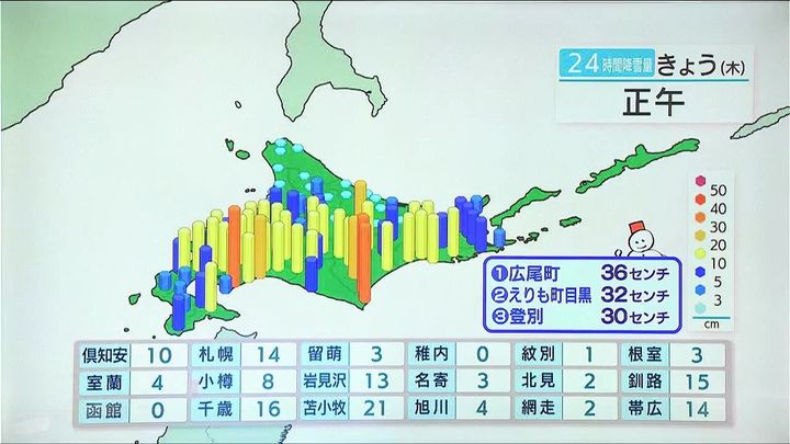 きょう6日の正午までの24時間に降った雪です。5日から太平洋側を中心に雪が降りました。札幌や千歳、釧路、帯広で15センチくらい。そして十勝南部の広尾町では36センチの大雪になりました。