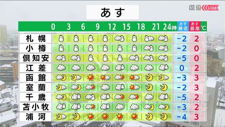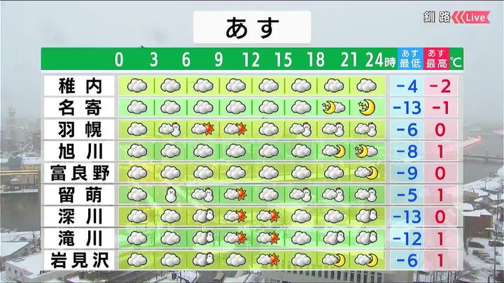 羽幌や留萌などでは朝晩を中心に雪が降り、留萌南部で雪の量が多くなりそうです。稚内や旭川、岩見沢は天気の大きな崩れはないでしょう。