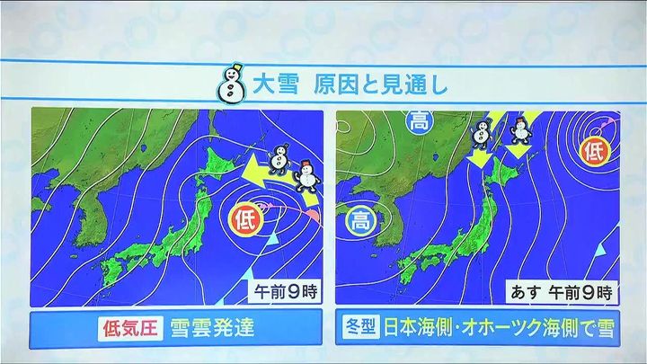 6日午前9時の天気図ですが、北海道の南に低気圧があります。低気圧に近い太平洋側に低気圧に伴う発達した雪雲が流れ込み、大雪になりました。