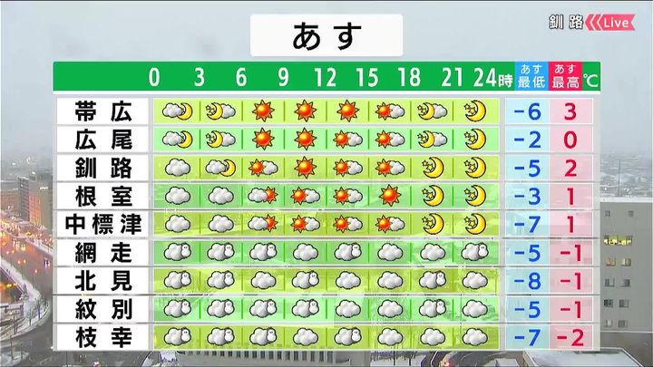 背景は6日午後5時ごろの釧路情報カメラ。積雪16センチと5日から10センチ以上積雪が増えました。路面は見えていますが、気温が0度くらいなのでブラックアイスバーンに注意して下さい。