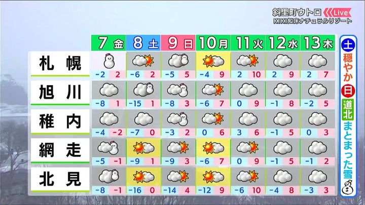 土曜日は雪が弱まりますが、日曜日は道北でまとまった雪の量になりそうです。来週は曇りますが、最高気温は5度以上で雪どけが進むでしょう。
