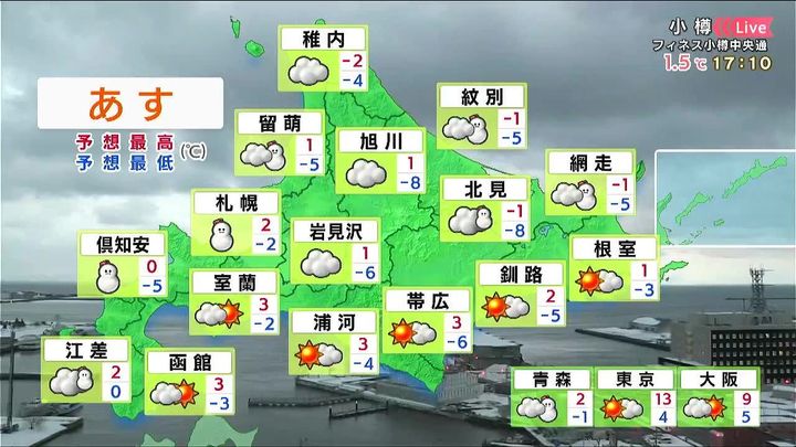 日本海側やオホーツク海側の海岸部を中心に雪が降るでしょう。太平洋側の天気は回復し、晴れる見込みです。気温は6日と同じかやや低くなるでしょう。