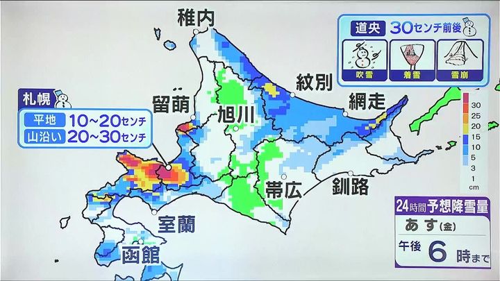 札幌周辺、石狩・後志地方で紫色、30センチ前後の大雪です。札幌市内の平地で10~20センチ、山沿いで20~30センチです。