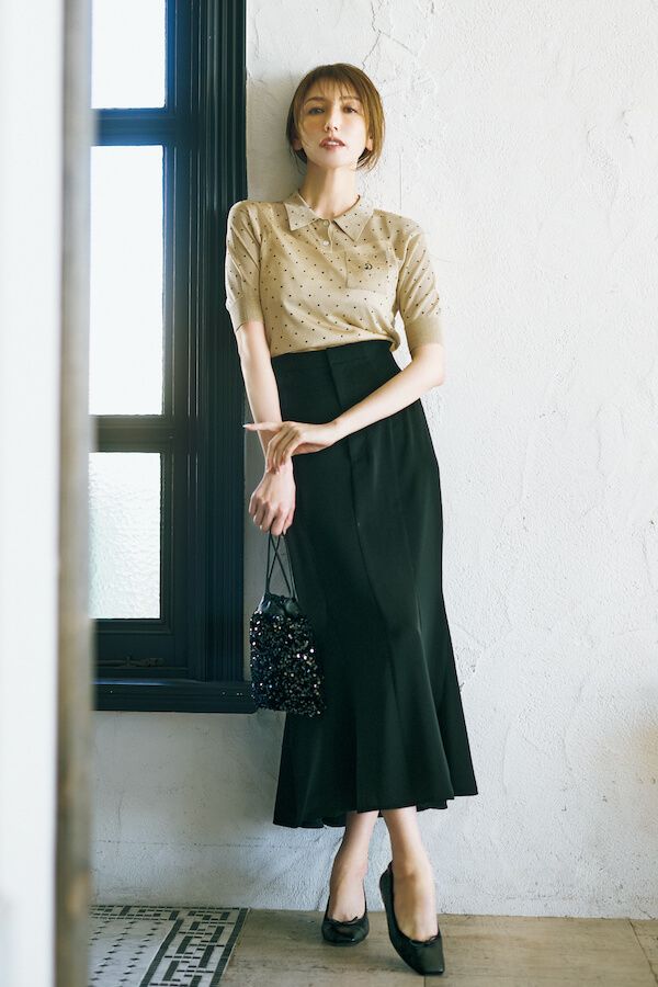 ほのかな透け感で、ポロニットがドキッとさせる美人ムード。シックなスカートで、その魅力を加速させて。