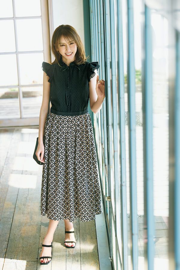 ジャカードのドット柄が潜む黒のブラウスと、オーバーラップサークル柄のスカートをドッキング。楽な着心地でも、印象はエレガントに。