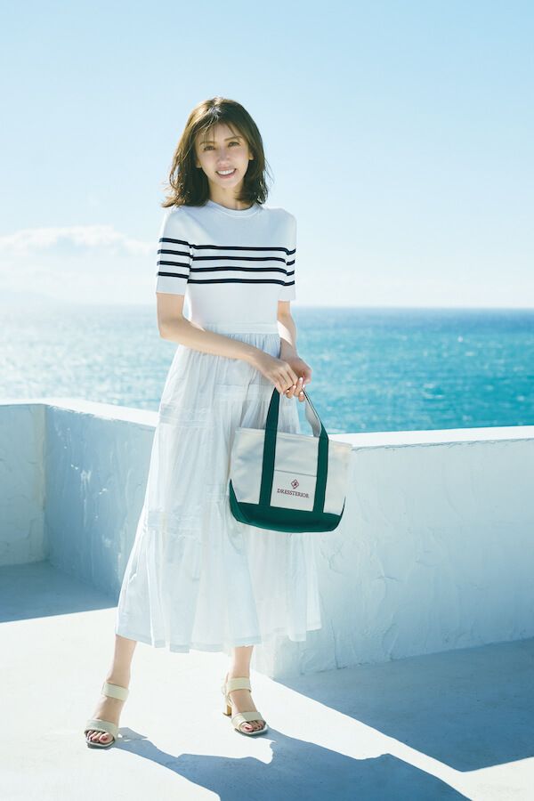 ボーダー柄ニットとティアードスカートのドッキングデザインなので、上下の異素材感によるメリハリがしっかり。ドレステリアのロゴ刺繍がリッチ感を醸すミニキャンバストートをさらりと合わせ、軽快な気分でおでかけを。
