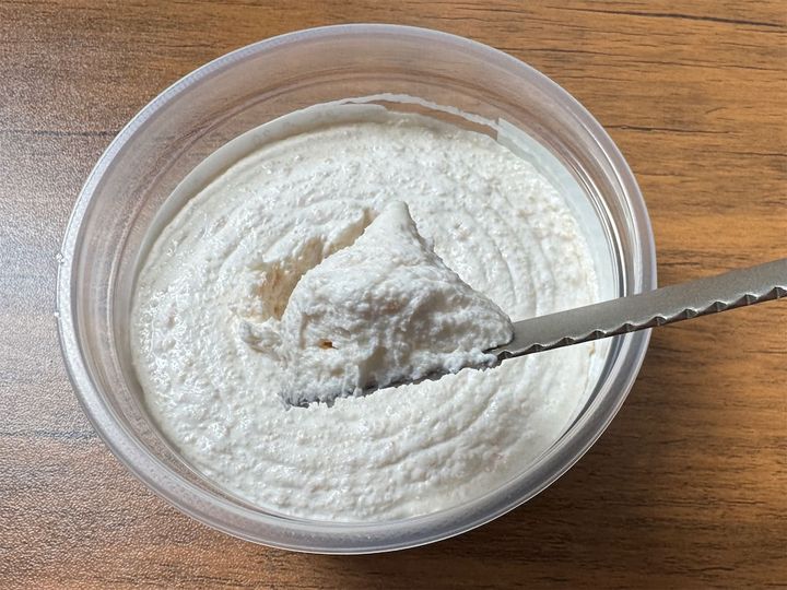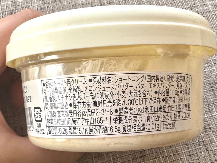 バターナイフですくってみると、砂糖がジャリジャリと入ったクリーム状のスプレッドでした。なめてみると砂糖の甘さと、油脂の味がします。ほんのりとですが、メロンの風味も感じられました。