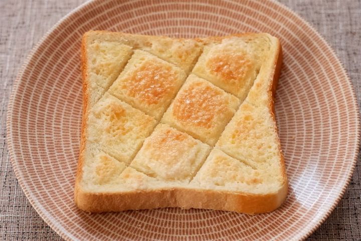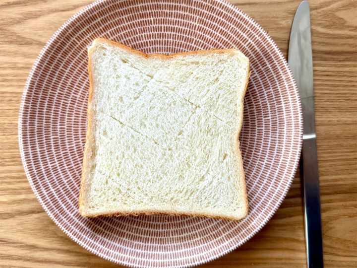 まずはテーブルナイフで、食パンに格子状の切れ目を入れます。パンの下まで切るのではなく、表面のみ切れていれば大丈夫です。