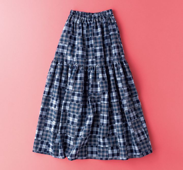 パッチワーク地で作ったロング丈。軽い着心地でシーズンレスで楽しめそうです。スカート¥41,800(ダブルスタンダードクロージング/フィルム)