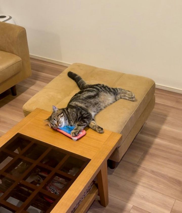 もなか君が枕にして寝ていたのは、長時間使われ温かくなったゲーム機Switchでした。頬をぴっとりとSwitchに付け、至福の表情で寝ているもなか君に、幸せな気持ちになりますね。
