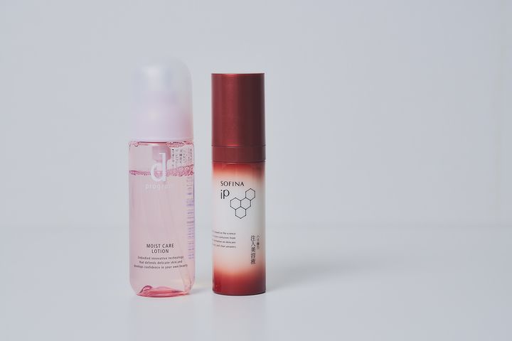 30代後半にさしかかり肌が敏感に傾くシーンが増えてきてから、デイリーで使う化粧水は敏感肌対応のものにシフト。dプログラムのモイストケアローション(左)は肌馴染みが良くて、ハンドプレスで浸透させることもあるし、コットンパックをすることも。肌の盤石な土台を整えてくれる安心感がありますね。そしてハリ感を出すために、ソフィーナipのハリ弾力注入美容液(右)をプラス。ベタつかない軽いテクスチャーだから、次に使う下地やファンデーションがヨレなくて重宝しています。これを朝使うと肌がピンと張る感じがしますね。若い頃ってそもそも張っていたから“ハリ感”ってなんのことだかイメージがつきませんでしたが、「これか!」と今では悲しいかな痛感(笑)。でも優れたコスメの効果を実感できるので、若い頃よりもスキンケアが楽しくなりました!