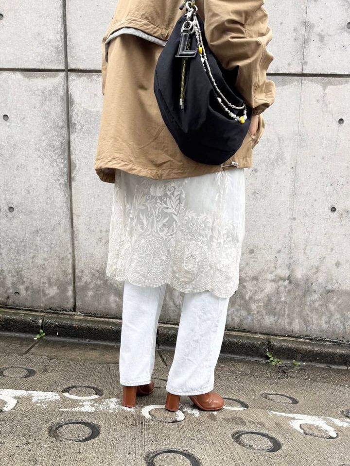 「BONNY WOVENの新作、スーパーブリーチデニムは明るい色みが春を感じさせてくれる一本。このデニムにナイロンブルゾンを合わせたスポーティなムードに、白のレーススカートで可憐さをプラスしたMIXスタイルが今の気分です。ヒールで颯爽と歩きつつ、ナイロンバッグで軽やかさを意識しました」