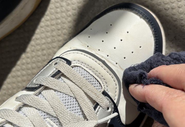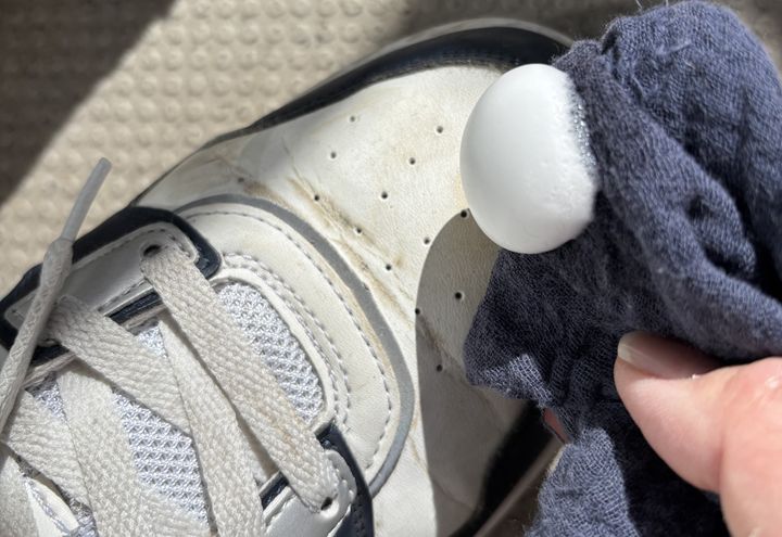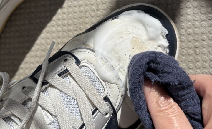 履きジワの谷間だけは少し力を入れてこすりましたが、それもすぐにきれいに。ある程度汚れが取れたところで、泡が乾ききる前に、乾いた布でふきとります。