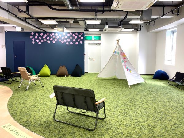 テントやキャンプチェア、クッションなどが置かれ、戸外でのんびりくつろぐように本を読めるところです。意外と隅っこが人気があるみたい。