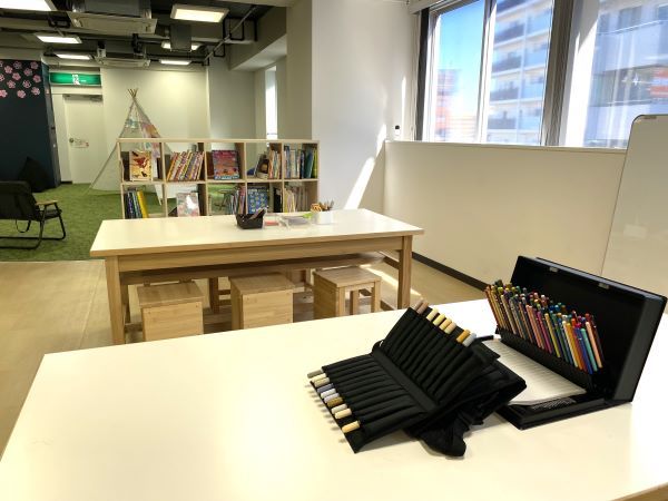 その奥には図工机が2つ置かれ、机の上にはたくさんの色のペンや折り紙、はさみが置かれています。周りの本棚には工作関係の本が並び、子どもたちの創作意欲が高まりそうです。