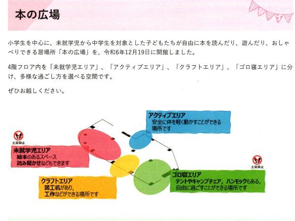 「本の広場」の対象は未就学児から中学生まで(保護者の付き添いは小学校3年生まで)。スタッフの方によると、蔵書は絵本や図鑑、漫画など約5000冊。閲覧のみで、貸し出しはなしとのことでした。