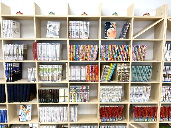 驚いたのは漫画がずらっと並んでいること。ふつう図書館ではあまり見られない書棚かもしれません。