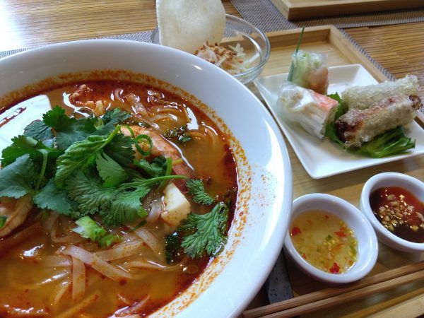 この日はベトナム料理の王道、フォーを。フォーは、牛肉、鶏肉、海鮮スパイシーから選べたので海鮮スパイシーをチョイス。ベトナム生春巻き、青パパイヤのサラダ、海鮮揚げ春巻き、デザート付きでボリューム満点でオイシイ~。海鮮スパイシーフォーは、トムヤムクンのような味わいで感動しました!!