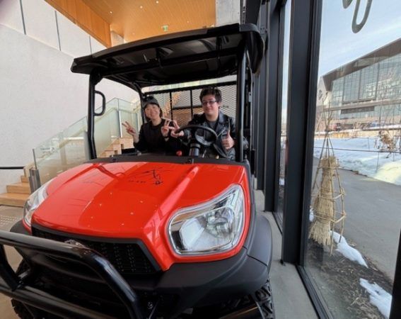 アメリカで人気が高いユーティリティビークル。日ハムファイターズ選手のサイン付!がCAFE入口に。2階は最先端の作物栽培を体験できるブースです。