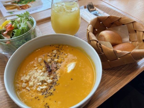 野菜とろとろ人参ポタージュ(790円)。セット(1,320円)。サラダには、ここ「KUBOTA AGRI FRONT植物工場」で育った新鮮なリーフレタスが使われています。