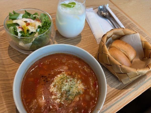 野菜ざくざくミネストローネ。単品だと790円。パンかご飯、ドリンクセットで1320円。玄米パンとラッシー。